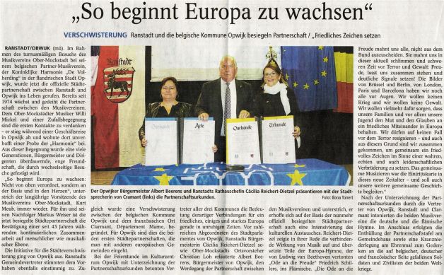 Als besondere Würdigung dieser Verbrüderung unterzeichneten die mitgereiste Ranstädter Bürgermeisterin Cäcilia Reichert-Dietzel und Albert Beerens, der Bürgermeister von Opwijk, am Sonntagmorgen eine offizielle Städtepartnerschaft und enthüllten ein entsprechendes Schild am Gemeindehaus.