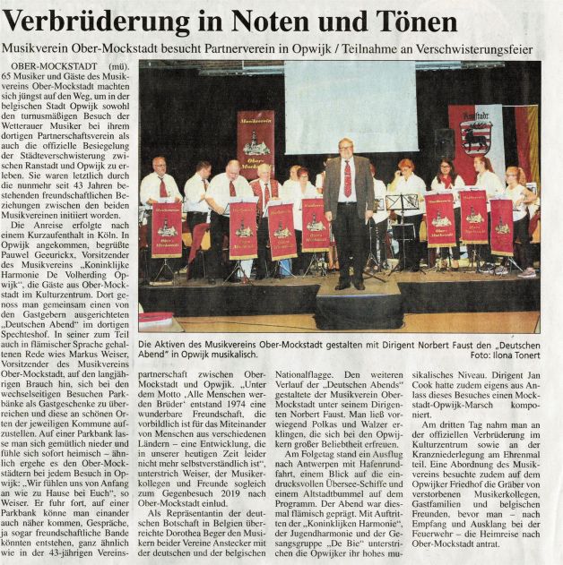 So machten sich auch Ende Septemberüber 50 Ober-Mockstädter auf den Weg nach Belgien, wo sie am frühen Freitagnachmittag gewohnt herzlich empfangen wurden. Alle Musikfreunde waren noch am selben Tag zum deutschen Abend mit dem Konzert des Musikvereins Ober-Mockstadt geladen. Unter der Leitung von Norbert Faust begeisterte das Orchester mit flotten Märschen und schwungvollen Polkas. Kurt Meub, der mit viel Witz durch das Programm führte, motivierte die Zuhörer auf deutsch und flämisch zum Schunkeln. Im Rahmen des Konzertes begrüßte auch der 1. Vorsitzende Markus Weiser alle Anwesenden und überreichte als Gastgeschenk die obligatorische Parkbank. Eine Parkbank als Ort für die Entstehung neuer Freundschaften und als ein Ort zum gemeinsamen Altwerden gelte als Symbol für die gegenseitigen Besuche der befreundeten Vereine, so Weiser. Er dankte allen, die sich um den Erhalt dieser besonderen Freundschaft bemühen. Antwerpen war das diesjährige Ziel des Samstagsausflugs. Nach einer Rundfahrt in Europas zweitgrößtem Hafen und einem ausgiebigen Mittagessen in einer Brauerei, schlenderten die Ober-Mockstädter durch die wunderschöne Altstadt mit der imposanten Liebfrauenkathedrale. Abends eröffnete das Jugendorchester den belgischen Abend mit einem beeindruckenden Konzert mit anspruchsvollen und stimmungsgvollen Musikstücken. Mit deutschen und flämischen Stücken präsentierte sich der neue Männergesangverein aus Opwijk.