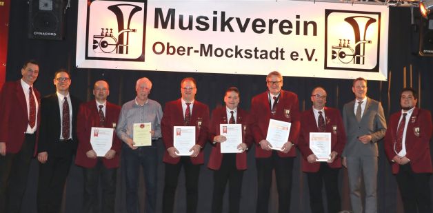 V.l. Vorsitzender Markus Weiser, Dirigent Alexander Eckhard, Christian Stark , Stephan Meub, Matthias Heck, Thomas Strecker, Norbert Faust, Richard Müller, Präsident des Hess. Musikverbands Christoph Degen, stellvertr. Vorsitzender Alexander Naumann.